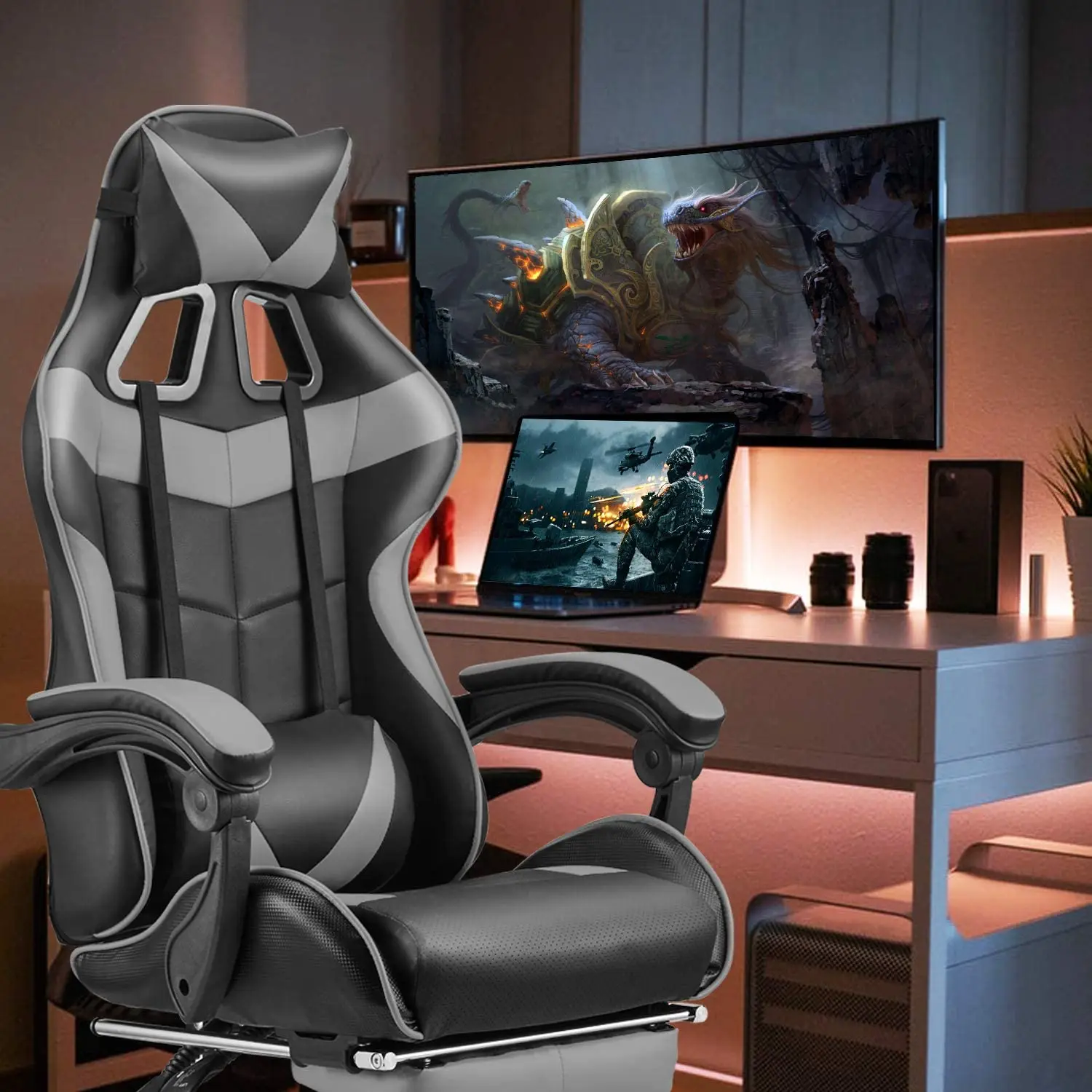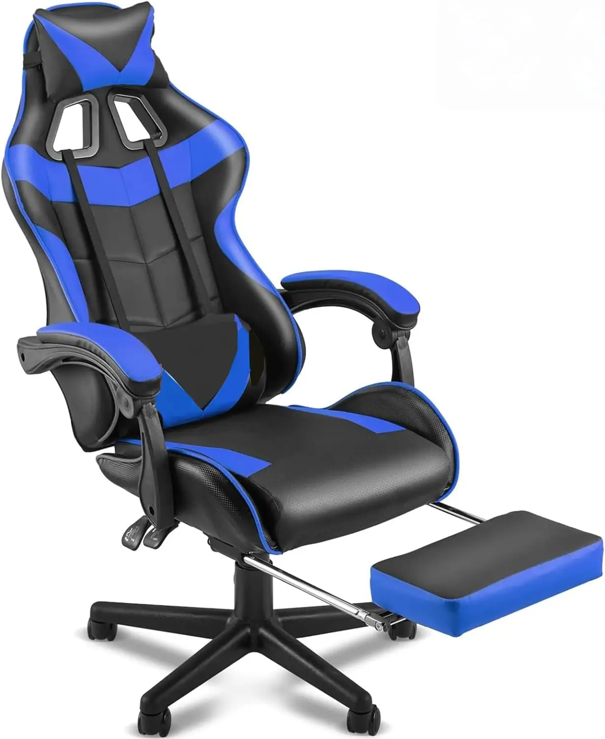 كرسي ألعاب مكتب جلدي مع دعم مريح وأسفل الظهر ومساند قدم قابلة للسحب وعجلات صامتة
